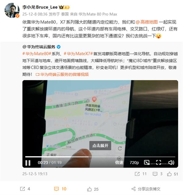 他介紹,借助華為Mate80、MateX7系列先進(jìn)的隧道內(nèi)定位技術(shù),華為與高德地圖合作完成了重慶解放碑環(huán)道的精準(zhǔn)導(dǎo)航測試。