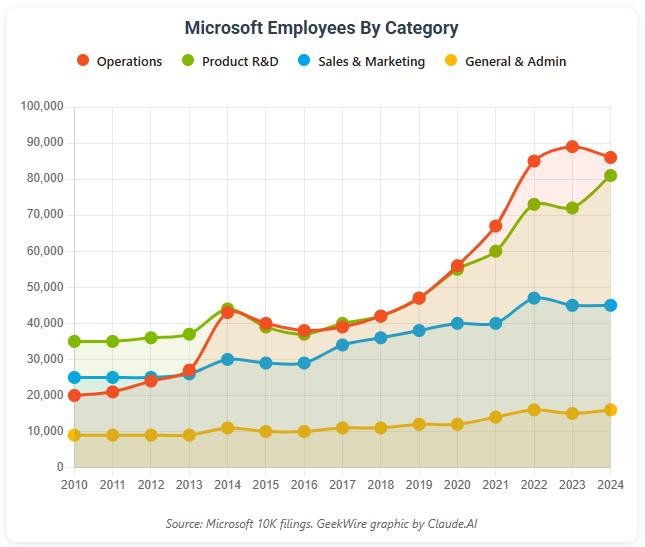 2010-2023年微軟不同部門(mén)員工變化。運(yùn)營(yíng)與研發(fā)人數(shù)激增,行政和市場(chǎng)崗位幾乎停滯,組織結(jié)構(gòu)“啞鈴化”趨勢(shì)明顯。