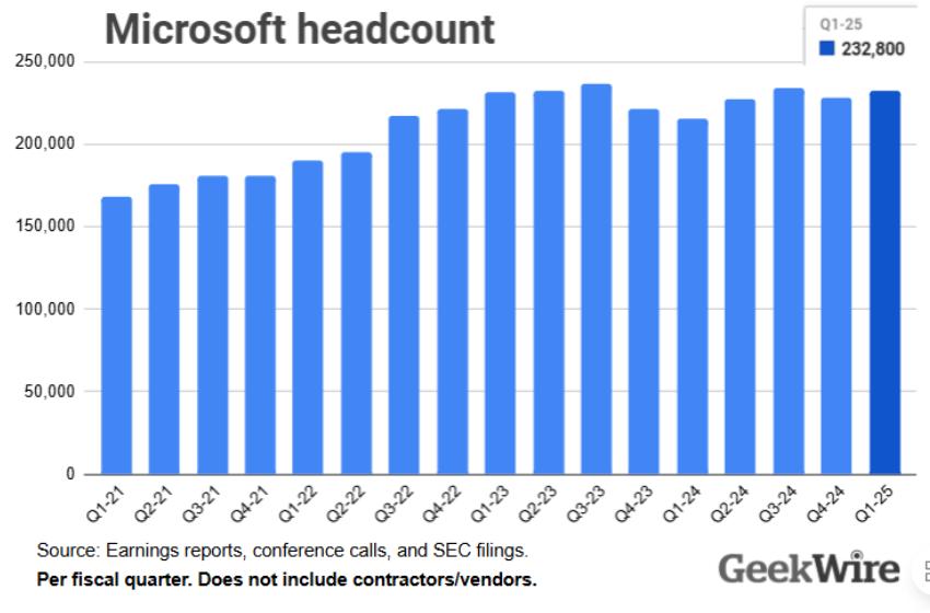 2021-2025財(cái)年微軟員工總數(shù)變化。AI擴(kuò)張期曾帶來(lái)用工高峰,但2023年后進(jìn)入重組階段,員工規(guī)模未劇減,結(jié)構(gòu)卻已徹底重構(gòu)。