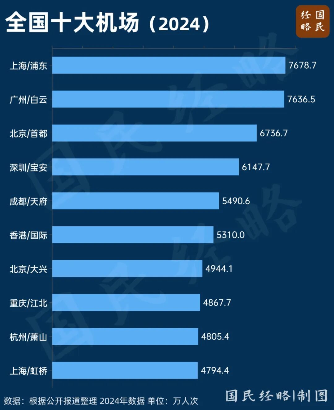 2024年,大灣區(qū)機場旅客吞吐量達2.14億人次,今年預(yù)計突破2.3億人次。其中廣州、深圳、香港三大國際機場的年旅客吞吐量均超過5000萬人次,而全國年旅客吞吐量超5000萬人次的機場僅有6個,大灣區(qū)占了一半。