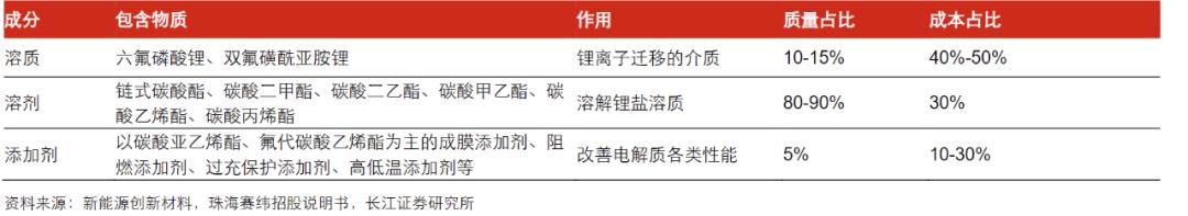 電解液主要由鋰鹽、有機(jī)溶劑及添加劑構(gòu)成,按質(zhì)量占比劃分,有機(jī)溶劑占比80%-90%,鋰鹽占比10%-15%,添加劑占比約5%;成本構(gòu)成層面,鋰鹽溶質(zhì)占電解液總成本比重較高。