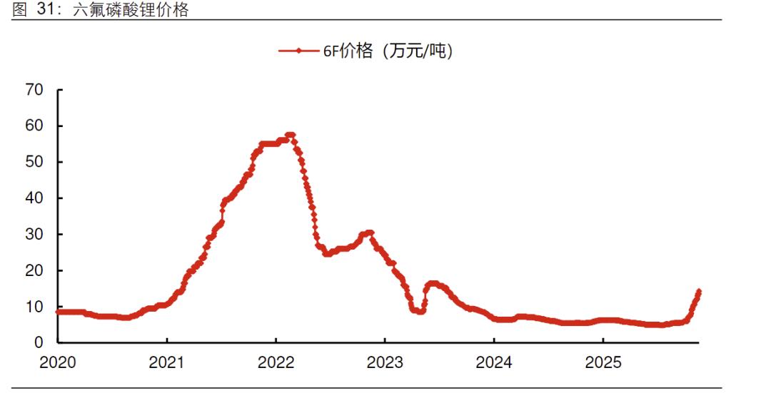 價(jià)格方面,六氟磷酸鋰自2025年8月底開啟上漲行情,10月后漲幅明顯加速,散單價(jià)格從底部不足5萬元/噸攀升至15萬元/噸左右,大客戶訂單價(jià)格亦呈現(xiàn)跟漲態(tài)勢(shì)。