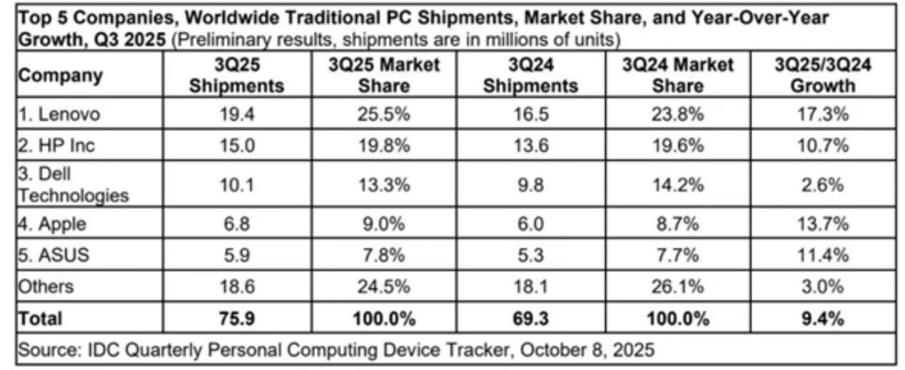 根據(jù)國際數(shù)據(jù)公司IDC最新發(fā)布的數(shù)據(jù),2025年第三季度,全球傳統(tǒng)個人電腦(涵蓋臺式機、筆記本電腦和工作站)出貨總量達7590萬臺,較去年同期的6930萬臺增長9.4%。其中,聯(lián)想繼續(xù)占據(jù)全球PC市場份額首位。排名第二至第五位的分別是惠普、戴爾、蘋果及華碩,市場占有率依次為19.8%、13.3%、9%和7.8%。