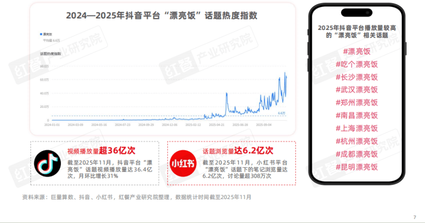 《報告》指出,今年以來“漂亮飯”在社交平臺的關(guān)注度持續(xù)上升。以抖音為例,相關(guān)話題視頻播放量已超36億次;小紅書平臺上,“漂亮飯”話題筆記瀏覽量截至11月達6.2億次,討論量超308萬次。