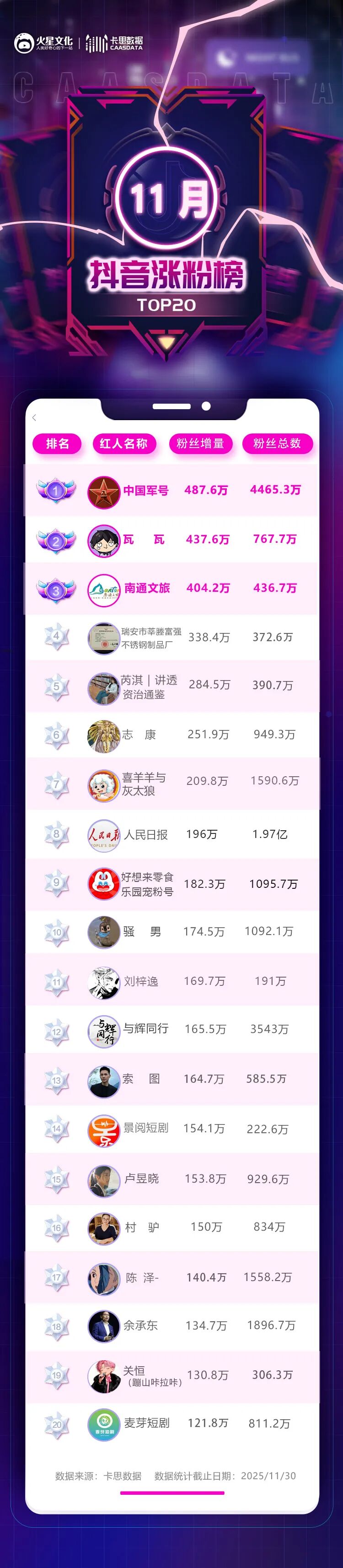 抖音11月漲粉榜已公布,讓我們一同解析: