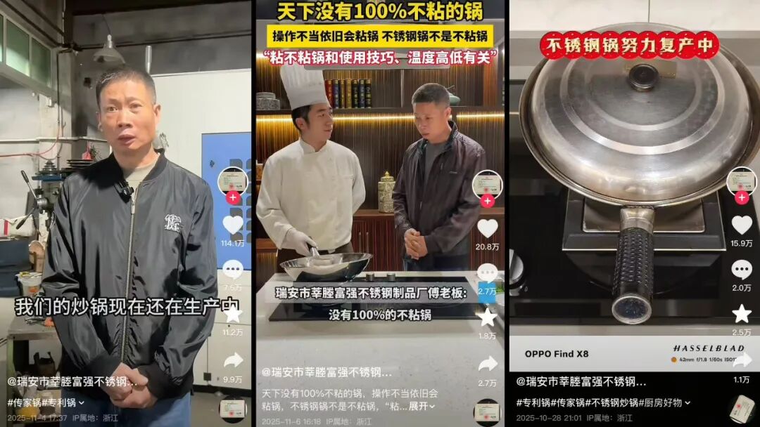 11月25日,“瑞安不銹鋼傳家鍋經(jīng)典復(fù)刻版”預(yù)售鏈接上線后,2萬(wàn)口鍋在25秒內(nèi)便被搶購(gòu)一空。與此同時(shí),該炒鍋生產(chǎn)商——瑞安市莘塍富強(qiáng)不銹鋼制品廠的抖音賬號(hào)近一個(gè)月漲粉至372.6萬(wàn),躋身11月漲粉榜前列。