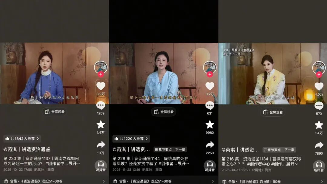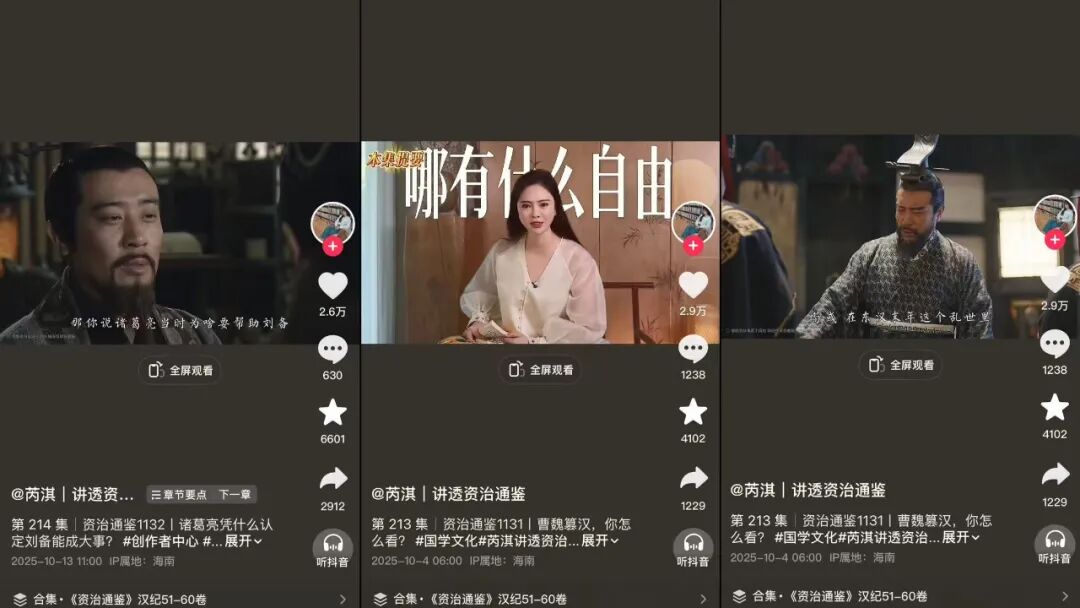 講述方式上,面對(duì)《資治通鑒》這樣的巨著,她會(huì)梳理復(fù)雜歷史事件的脈絡(luò),聚焦人物抉擇、困境與命運(yùn)起伏,以講故事的形式和通俗語(yǔ)言還原歷史。這種方式消解了知識(shí)的枯燥和復(fù)雜,吸引眾多用戶。