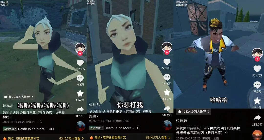 其中,游戲賬號(hào)@瓦瓦目前僅發(fā)布了10條作品,總粉絲量卻已接近800萬(wàn)。該賬號(hào)專(zhuān)注于游戲《無(wú)畏契約》,但其核心內(nèi)容并非硬核教學(xué)或精彩操作集錦,而是借助搞笑建模、魔性劇情與趣味配音,打造出極具喜劇效果和傳播力的“抽象小劇場(chǎng)”。這種將熱門(mén)游戲與抽象文化深度融合的獨(dú)特風(fēng)格,吸引了大量用戶關(guān)注,多條視頻點(diǎn)贊量突破500萬(wàn),使其一躍成為游戲區(qū)的“另類(lèi)頂流”;