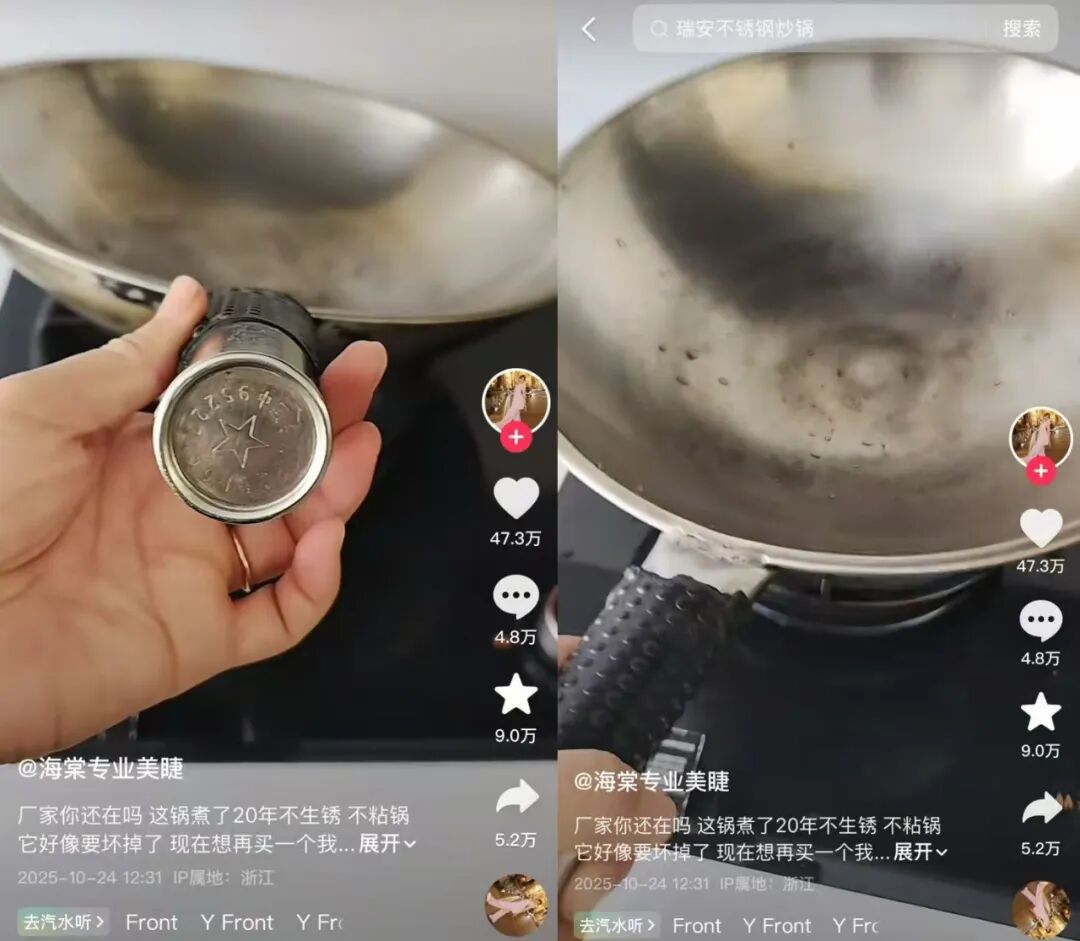 今年10月24日,用戶@海棠專(zhuān)業(yè)美睫發(fā)布了一條15秒的視頻,鏡頭聚焦一口炒鍋并進(jìn)行全方位展示,文案詢(xún)問(wèn):“廠家還在嗎?這鍋用了20年,不生銹、不粘鍋,現(xiàn)在好像要壞了,想再買(mǎi)一個(gè)去哪里買(mǎi)”。