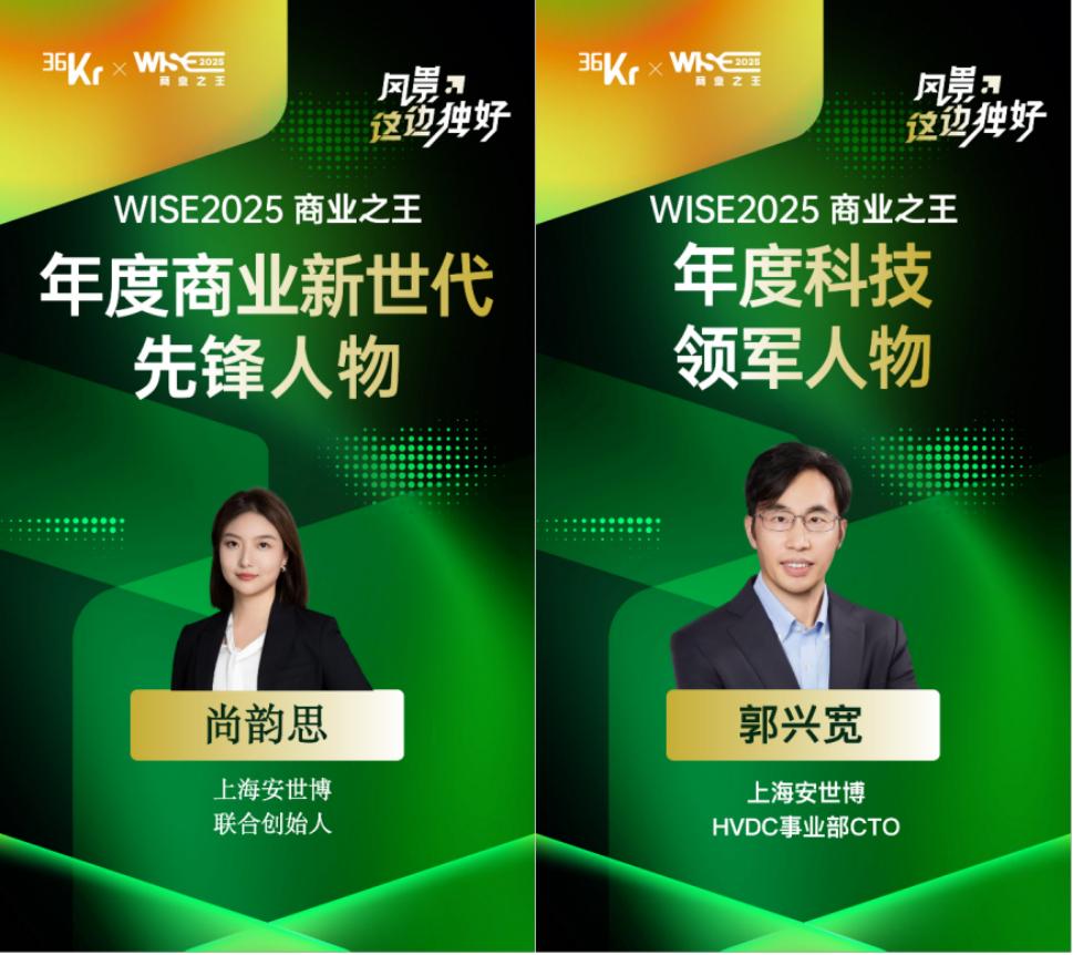 在此背景下,上海安世博能源科技有限公司聚焦電網(wǎng)與算力機架間的電能轉(zhuǎn)換環(huán)節(jié),以直流(DC)供電方案為核心,推動數(shù)據(jù)中心供電架構(gòu)的革新。近期,在36氪《WISE2025商業(yè)之王系列年度名冊》評選中,安世博聯(lián)合創(chuàng)始人尚韻思與數(shù)據(jù)中心供電事業(yè)部CTO郭興寬分別榮獲商業(yè)新世代先鋒人物與年度科技領(lǐng)軍人物獎項。