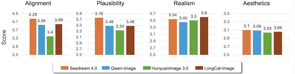 綜合評(píng)測(cè)結(jié)果顯示,在人類主觀評(píng)分(MOS)維度上,LongCat-Image在文本對(duì)齊、視覺真實(shí)度與美學(xué)質(zhì)量等多個(gè)子項(xiàng)上的表現(xiàn)已經(jīng)接近Seedream4.0等商業(yè)模型的水平。