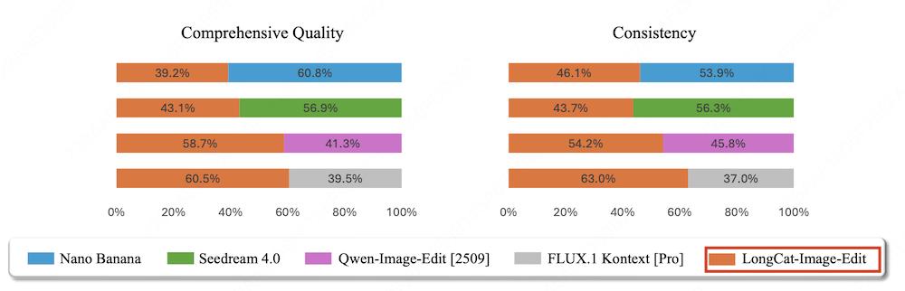 在圖像編輯任務(wù)的并列對(duì)比評(píng)估(SBS)中,LongCat-Image-Edit在綜合質(zhì)量與一致性這兩項(xiàng)關(guān)鍵指標(biāo)上,相對(duì)于NanoBanana和Qwen-Image-Edit等模型都取得了較高的勝率。