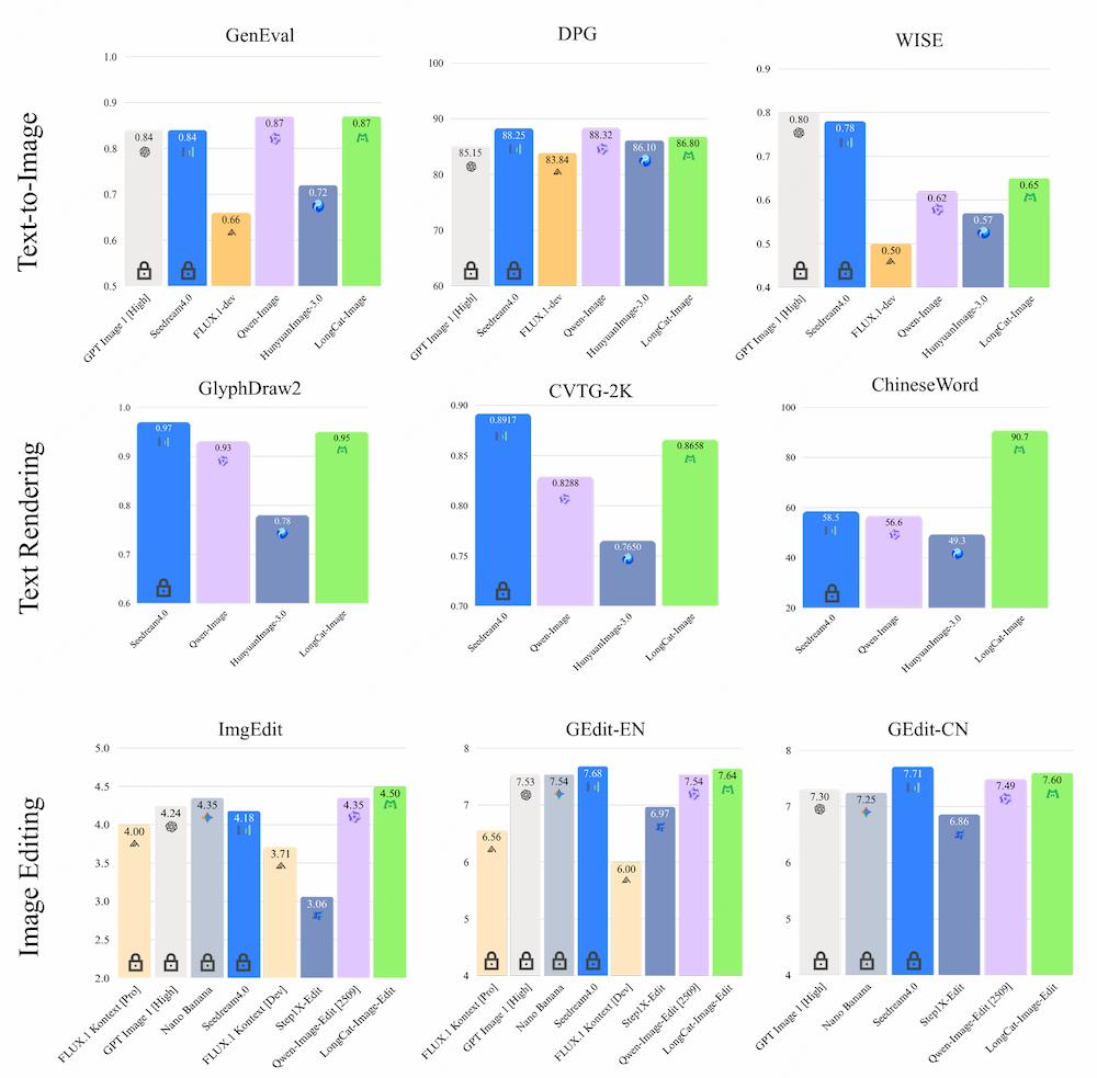 根據(jù)官方公布的基準(zhǔn)測(cè)試結(jié)果,LongCat-Image主要與Seedream4.0、Qwen-Image、HunyuanImage-3.0、Nano Banana以及FLUX.1-dev等主流的開源和閉源生圖模型進(jìn)行了對(duì)標(biāo),其核心優(yōu)化方向集中在“編輯可控性”和“中文文字渲染”這兩項(xiàng)關(guān)鍵能力上。