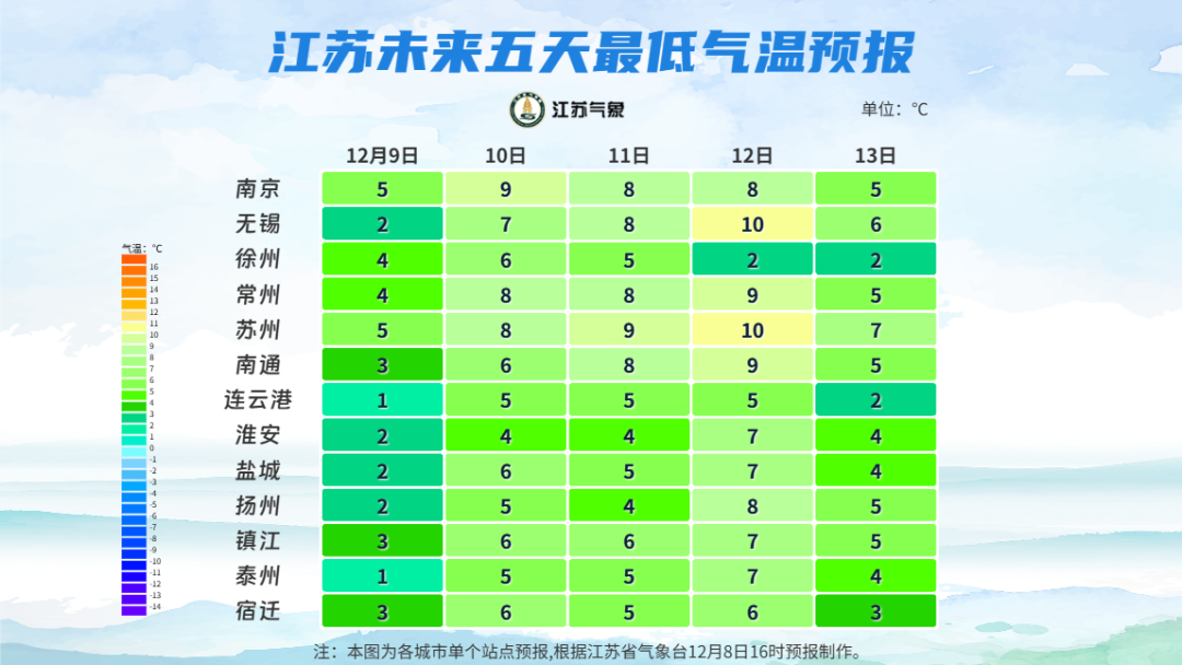 本周江蘇將迎來(lái)兩次冷空氣活動(dòng)。前期受弱冷空氣影響,全省氣溫出現(xiàn)小幅下降;周中(10日至11日)氣溫逐步回升。12日至14日,強(qiáng)冷空氣來(lái)襲,全省大部分地區(qū)最低氣溫將下降8~10°C,14日早晨氣溫達(dá)到近期低點(diǎn):淮北地區(qū)-4~-6°C,伴有冰凍;蘇南地區(qū)0~2°C;其他地區(qū)-1~-3°C。