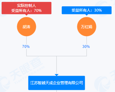 公告指出,智越天成是玖星精密的控股股東,其持股比例為46.1165%。通過(guò)天眼查查詢(xún)可知,智越天成的股東為胡濤和萬(wàn)紅娟,兩人持股比例分別為70%和30%。