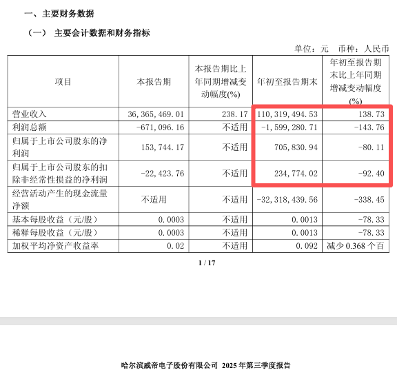 2025年前三季度,威帝股份實(shí)現(xiàn)營(yíng)業(yè)收入1.10億元,同比增長(zhǎng)138.73%;歸母凈利潤(rùn)為70.58萬(wàn)元,同比下降80.11%;扣非后凈利潤(rùn)為23.48萬(wàn)元,同比下降92.40%。