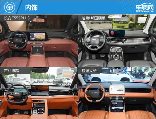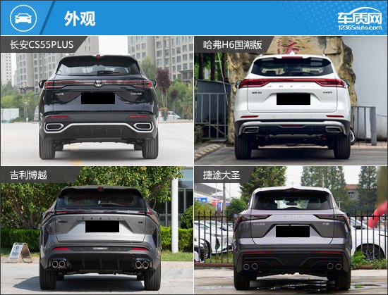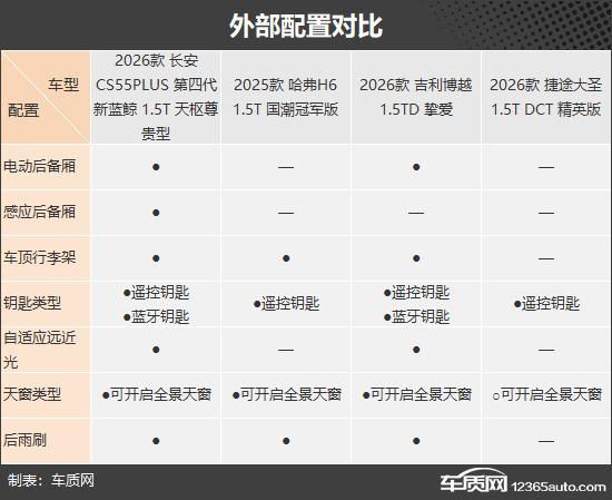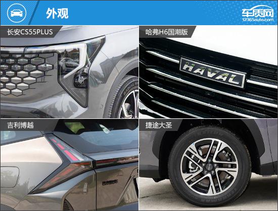 外部配置上,長(zhǎng)安CS55PLUS和吉利博越表現(xiàn)更全面,長(zhǎng)安CS55PLUS還是唯一配備感應(yīng)后備廂的車型;哈弗H6國(guó)潮版和捷途大圣的外部配置相對(duì)基礎(chǔ),捷途大圣缺少車頂行李架、后雨刷,可開(kāi)啟全景天窗也為選配,配置水平稍顯遜色。