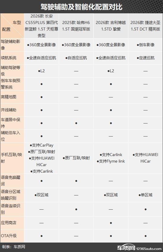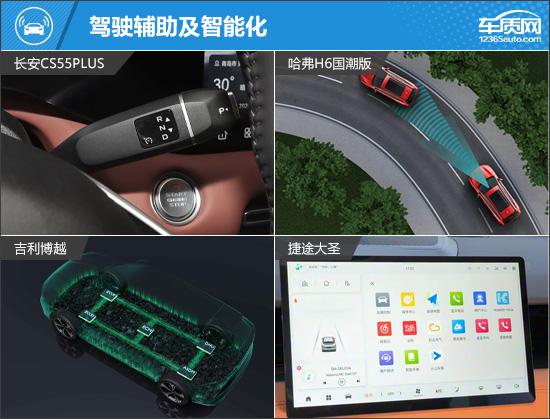駕駛輔助上,長(zhǎng)安CS55PLUS和吉利博越達(dá)到L2級(jí)輔助駕駛,長(zhǎng)安CS55PLUS的輔助駕駛功能更豐富,表現(xiàn)最佳;捷途大圣僅搭載倒車影像和定速巡航,輔助能力有限。