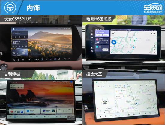 內(nèi)飾部分,四款車的用料都比較扎實(shí),均有大面積軟質(zhì)材料包覆。長(zhǎng)安CS55PLUS采用簡(jiǎn)約風(fēng)格,雙聯(lián)屏設(shè)計(jì)搭配電子式懷擋,布局工整大氣,中控臺(tái)下方保留的物理按鍵讓操作更便捷;哈弗H6國(guó)潮版、吉利博越和捷途大圣均搭載懸浮式中控屏,配備傳統(tǒng)電子擋把,保留了燃油車的熟悉感,其中哈弗H6國(guó)潮版的中控臺(tái)偏向駕駛員一側(cè),運(yùn)動(dòng)氛圍更濃。