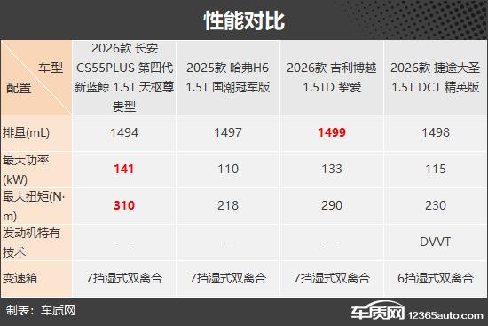 動(dòng)力上,四款車均搭載1.5T渦輪增壓發(fā)動(dòng)機(jī),長(zhǎng)安CS55PLUS的最大功率和最大扭矩領(lǐng)先,動(dòng)力表現(xiàn)更強(qiáng);捷途大圣的發(fā)動(dòng)機(jī)配備了奇瑞的DVVT技術(shù),提升了燃燒穩(wěn)定性和燃油經(jīng)濟(jì)性。傳動(dòng)系統(tǒng)方面,捷途大圣采用6擋濕式雙離合變速箱,其余三款為7擋濕式雙離合,兼顧了成本與傳動(dòng)效率。