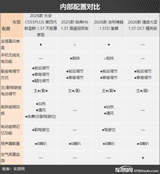 內(nèi)部配置方面,長(zhǎng)安CS55PLUS和吉利博越整體更出色,長(zhǎng)安CS55PLUS的座椅功能更豐富,提升了乘坐舒適性;哈弗H6國(guó)潮版標(biāo)配前排手機(jī)無(wú)線充電,捷途大圣則是唯一搭載空氣質(zhì)量監(jiān)測(cè)的車型,各有亮點(diǎn),但兩者都缺少座椅加熱、副駕駛電動(dòng)調(diào)節(jié)等基礎(chǔ)配置。