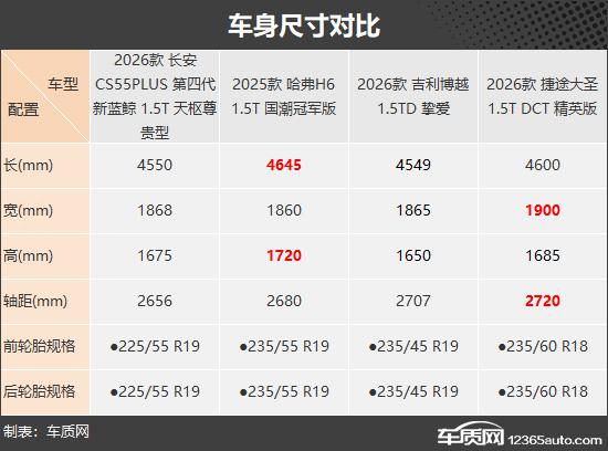 車身尺寸方面,哈弗H6國(guó)潮版在車長(zhǎng)和車高上占優(yōu),能提供更充裕的頭部空間;捷途大圣的車寬和軸距表現(xiàn)更佳,后排乘坐空間更寬敞;長(zhǎng)安CS55PLUS和吉利博越的尺寸雖無(wú)明顯優(yōu)勢(shì),但也完全能滿足日常代步需求。