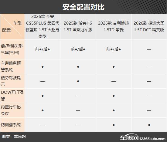 安全配置方面,吉利博越表現(xiàn)最全面,配備防側(cè)翻系統(tǒng),略勝長(zhǎng)安CS55PLUS一籌;捷途大圣雖也有防側(cè)翻系統(tǒng),但其他主被動(dòng)安全配置缺失較多,整體差距明顯;哈弗H6國(guó)潮版配置不算豐富,但搭配合理,是唯一配備疲勞駕駛提示的車型。