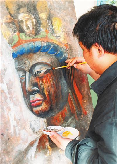 用家鄉(xiāng)山石顏料臨摹古跡時(shí),董英杰有著別樣的感受:“筆尖觸到紙上的顆粒感沉甸甸的,帶著溫度,仿佛我不是在畫(huà)畫(huà),而是在與千年前的工匠,通過(guò)同一座山里的石頭進(jìn)行一場(chǎng)跨越時(shí)空的對(duì)話(huà)。”(記者 郭佳)