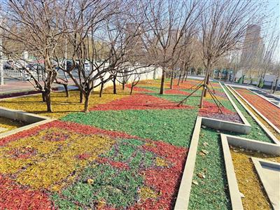 武清區(qū)城管委園林綠化中心工作人員介紹,草本花卉組合靈活,能營(yíng)造多樣氛圍,但天津的草花最遲10月底便會(huì)凋零。為此,該中心在10-11月開(kāi)展彩虹木屑制作與鋪裝:將園林修剪產(chǎn)生的樹(shù)枝、樹(shù)干粉碎篩選后染色,鋪在設(shè)計(jì)好圖案的綠地中,讓冬日地表有了繽紛色彩。目前,翠亨路、福源道等路段已投放50多噸彩虹木屑。
