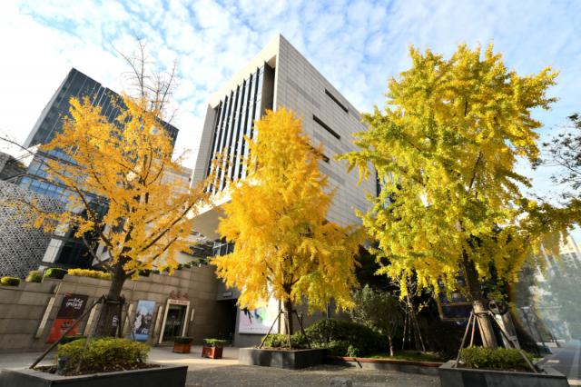 在這座藝術(shù)殿堂前,銀杏以最隆重的姿態(tài)登場。玻璃幕墻映出金色的樹影,古典與現(xiàn)代在光影之中交融碰撞。