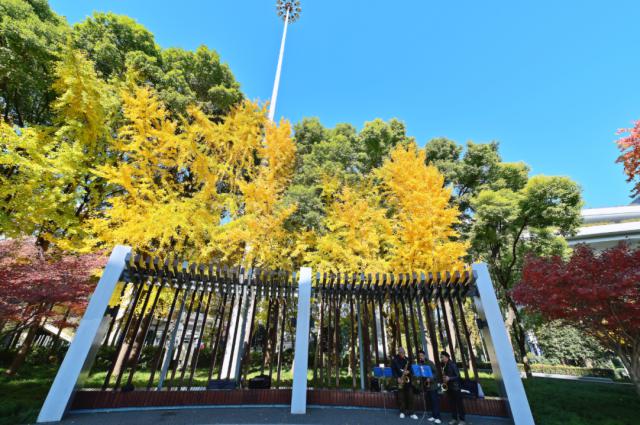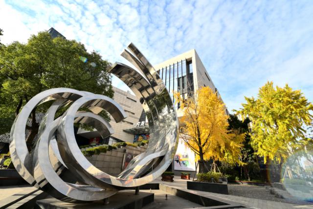 雕塑靜靜佇立,銀杏紛紛揚揚。藝術(shù)與自然在此展開對話——堅硬的線條被柔和的落葉環(huán)繞,充滿現(xiàn)代感的雕塑在金黃的帷幕之下,呈現(xiàn)出別樣的獨特意境。