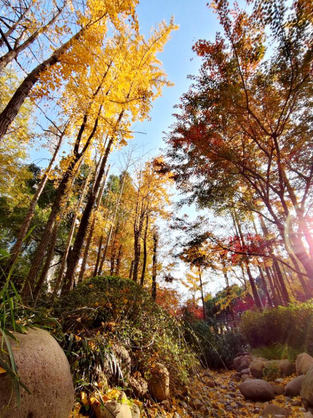 仰拍時,枝葉與藍(lán)天相互映襯,勾勒出都市天際線溫柔的邊框;低頭看時,落葉鋪成地毯,每一步踩上去都發(fā)出簌簌的輕響,這是城市喧囂中意外的抒情旋律。
