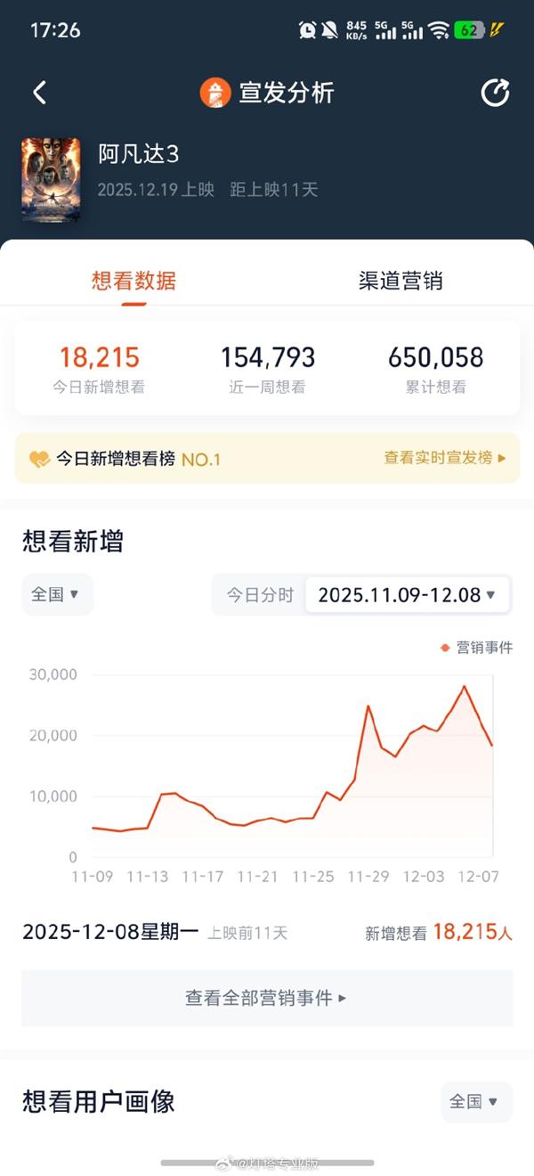 快科技12月9日消息,燈塔專業(yè)版數(shù)據(jù)顯示,電影《阿凡達(dá)3》在淘票票平臺(tái)的想看人數(shù)已突破65萬(wàn),該片定于12月19日正式上映。