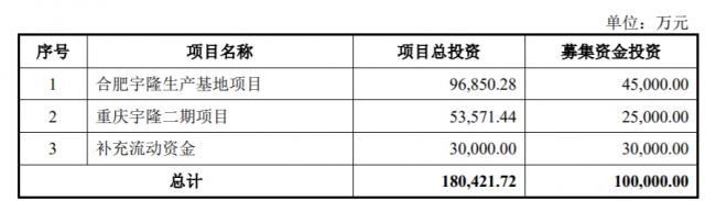 此次IPO,宇隆科技擬募資10億元,其中4.5億元投入合肥宇隆生產(chǎn)基地項(xiàng)目,2.5億元用于重慶宇隆二期項(xiàng)目,3億元補(bǔ)充流動(dòng)資金。
