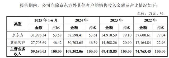 報(bào)告期內(nèi),宇隆科技來(lái)自京東方的主營(yíng)業(yè)務(wù)收入占比分別為77.04%、79.10%、53.61%和53.58%,均超五成。
