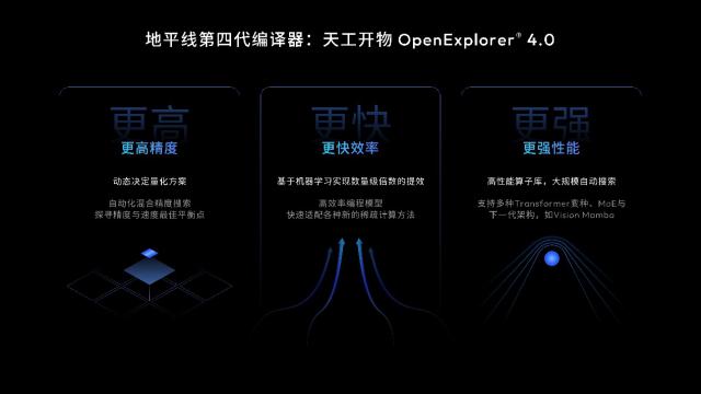 此外,本次發(fā)布的第四代編譯器天工開物OpenExplorer?4.0,實現(xiàn)了更高精度、更快效率和更強性能的突破,編譯速度從小時級提升至分鐘級,模型性能提升20%。其革命性在于引入AI驅(qū)動的優(yōu)化策略,標(biāo)志著編譯器技術(shù)從工具自動化,進入基于機器學(xué)習(xí)的自我進化新時代。