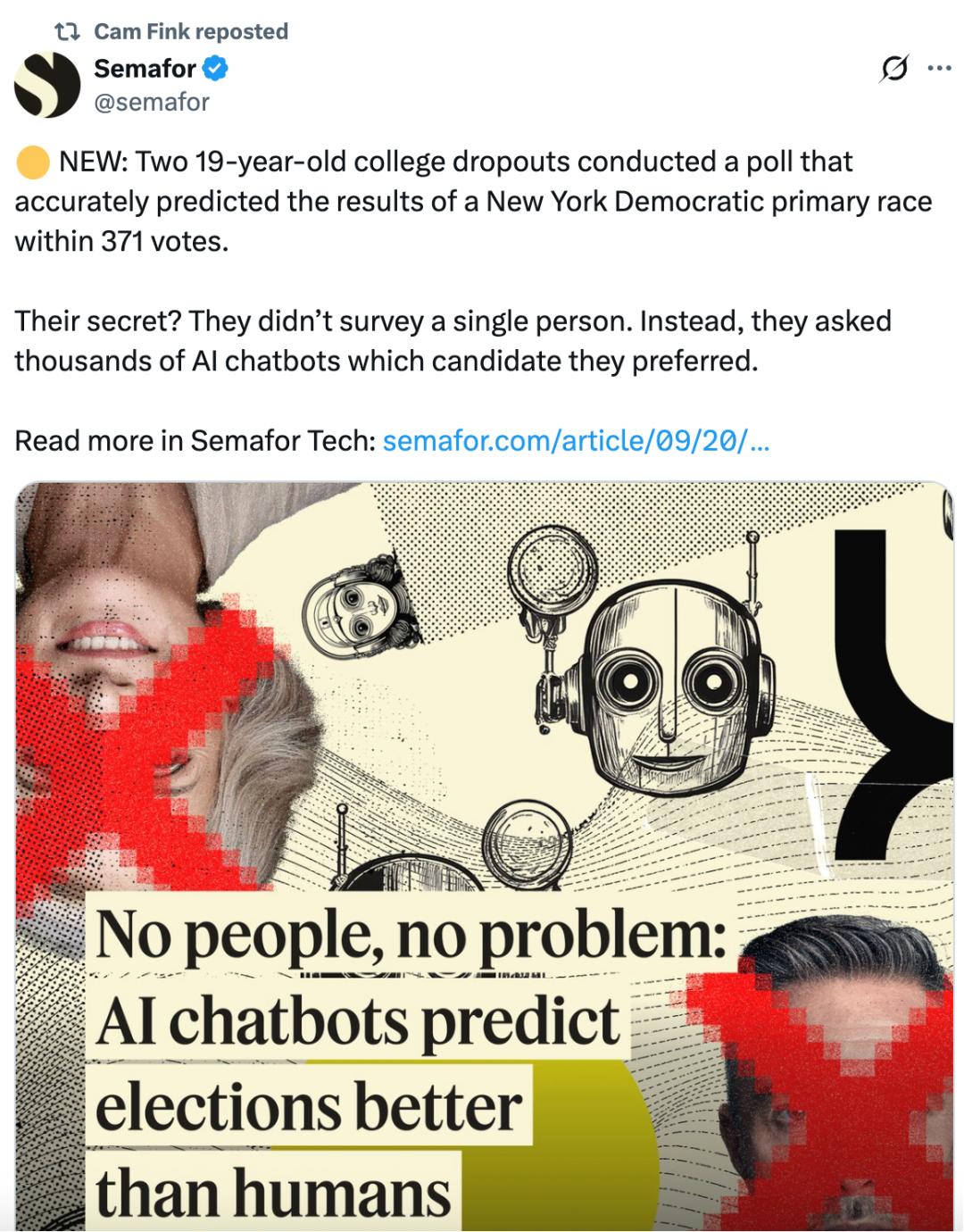 值得關(guān)注的是,據(jù)外媒Semafor報道,在2024年美國紐約州民主黨初選前,芬克和科曾用他們的產(chǎn)品開展“民意調(diào)查”,通過與成千上萬的AI聊天機器人互動,準(zhǔn)確預(yù)測了紐約州民主黨初選結(jié)果,預(yù)測數(shù)據(jù)與實際票數(shù)僅相差不到371票。