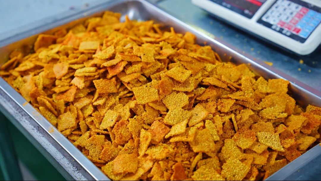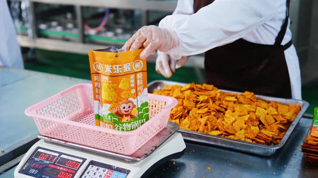 從粗糧原料到酥脆鍋巴,要經過智能油炸、自動拌料、封裝等多道工序。公司的八角拌料機三分鐘就能讓鍋巴均勻裹滿醬料,推出的醬香牛排味、麻辣味、原味等多種口味,精準契合了不同消費者的需求。