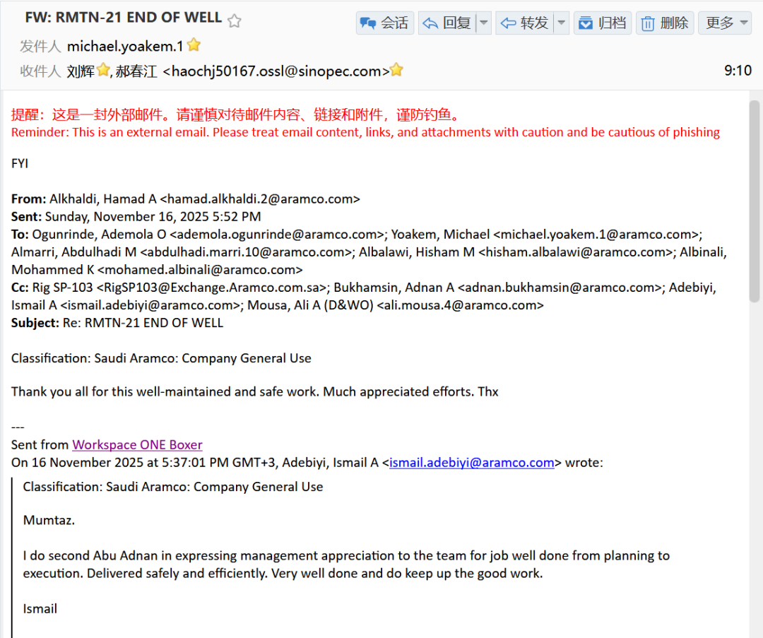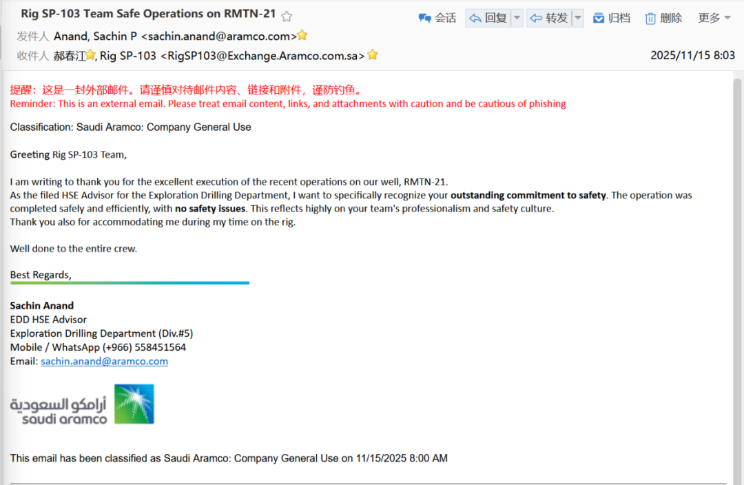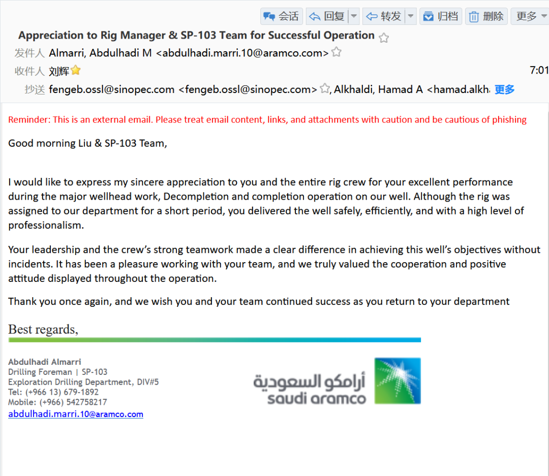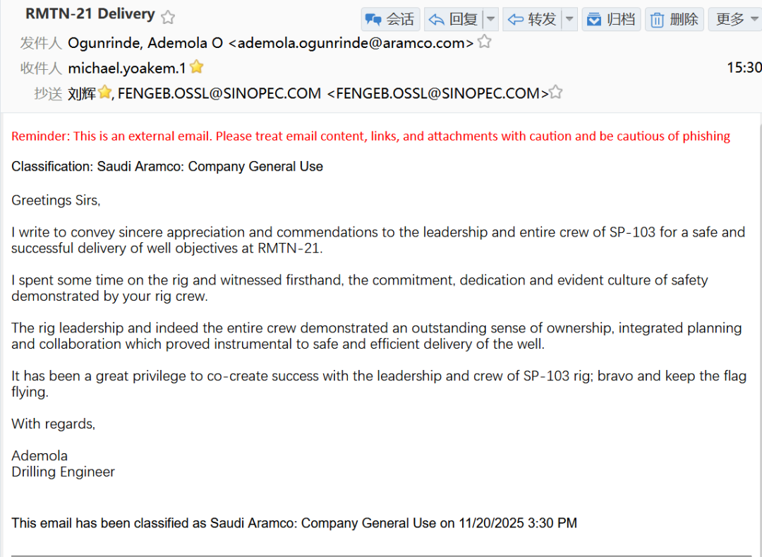 沙特阿美探井部工程師總監(jiān)Ismail Adebiyi與生產(chǎn)總監(jiān)Hamad Alkhaldi也轉(zhuǎn)發(fā)贊賞,將此次作業(yè)譽為“從規(guī)劃到執(zhí)行均表現(xiàn)優(yōu)異(Mumtaz)”的典范項目。