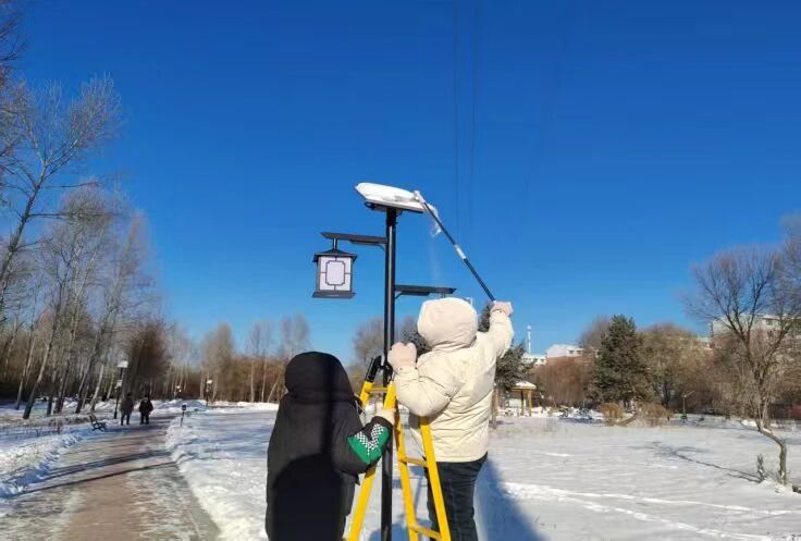 活動(dòng)期間,工作人員攜帶刮板、梯子、抹布等工具,對共享花園內(nèi)的每一盞路燈進(jìn)行細(xì)致清理。社區(qū)工作人員不懼嚴(yán)寒,分工合作,用刮板刮除積雪、抹布擦拭薄冰,全面清除了燈罩和太陽能燈板上的積雪與薄冰,保證每盞路燈都能正常發(fā)光。經(jīng)過數(shù)小時(shí)的認(rèn)真作業(yè),花園內(nèi)所有路燈的清理工作順利完成。