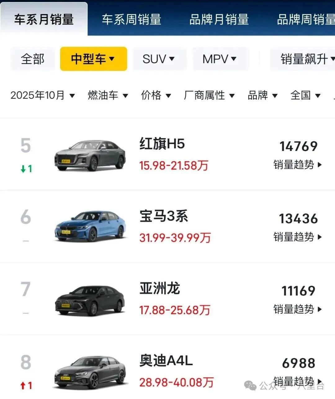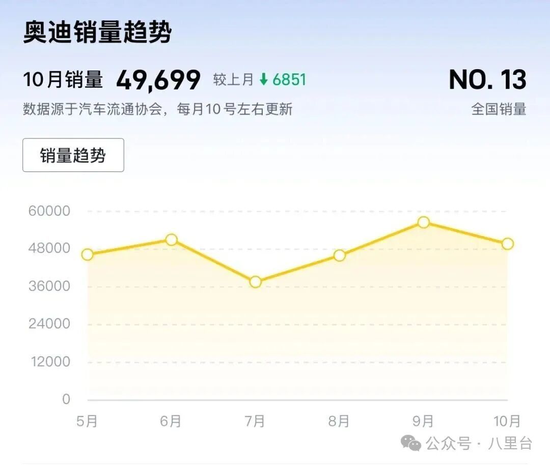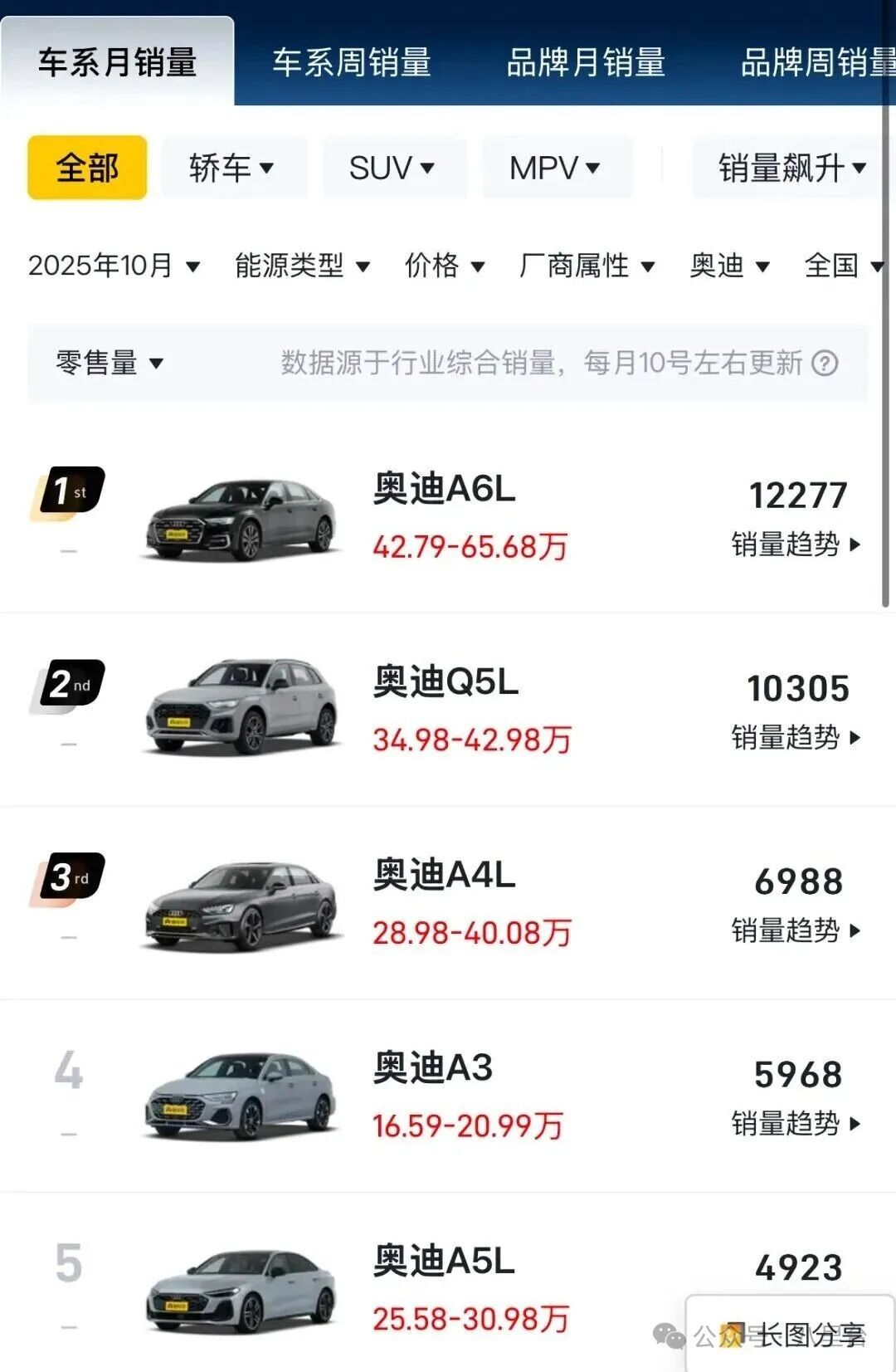 但出人意料的是,換帥當(dāng)月奧迪便反超奔馳寶馬,重回豪華車銷量第一的位置。其中,代表奧迪豪華形象的轎車功不可沒,10月A6、A4、A3累計(jì)銷量超25000臺(tái),占總量一半以上。