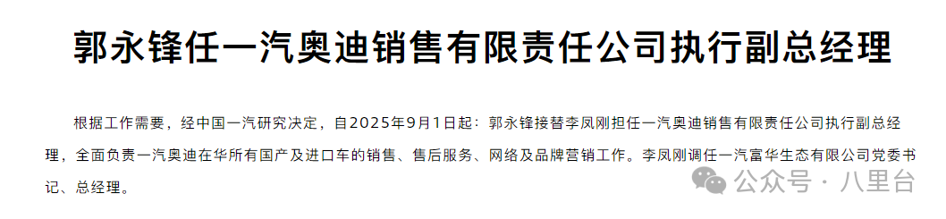 “郭永鋒接替李鳳剛出任一汽奧迪銷售執(zhí)行副總經(jīng)理”——這則9月1日的人事公告,起初并未引發(fā)太多關(guān)注。畢竟在豪華車市場(chǎng)的激烈競(jìng)爭(zhēng)中,高層變動(dòng)似乎只是常規(guī)操作。