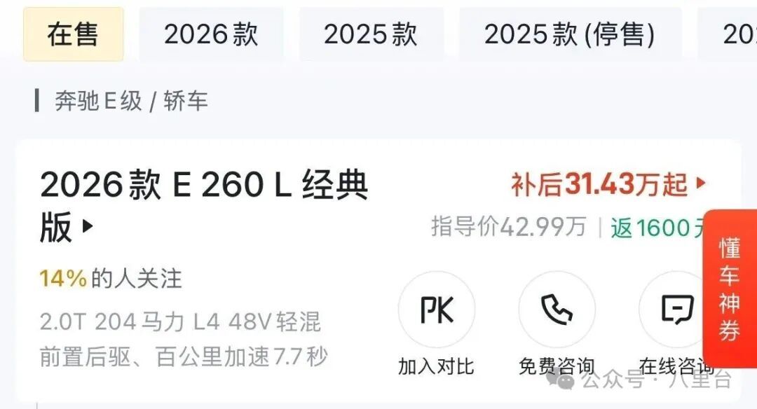 同為行政級(jí)轎車的奔馳E級(jí),入門級(jí)E260L補(bǔ)貼后價(jià)格仍在31萬(wàn)以上,守住了豪華品牌底線。
