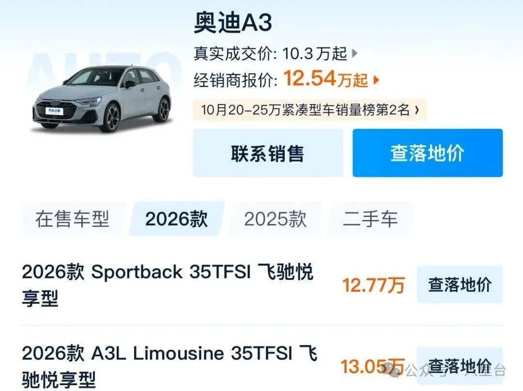 最后看令人驚訝的入門級(jí)A3,即“12萬(wàn)買奧迪”的主角。經(jīng)銷商報(bào)價(jià)低至12.5萬(wàn),正如“昔日高不可攀,如今觸手可及”。這與買比亞迪或卡羅拉有何區(qū)別?奧迪是否給兄弟品牌大眾留了空間?同級(jí)別的寶馬2系、奔馳A級(jí)成交價(jià)目前約15萬(wàn)。