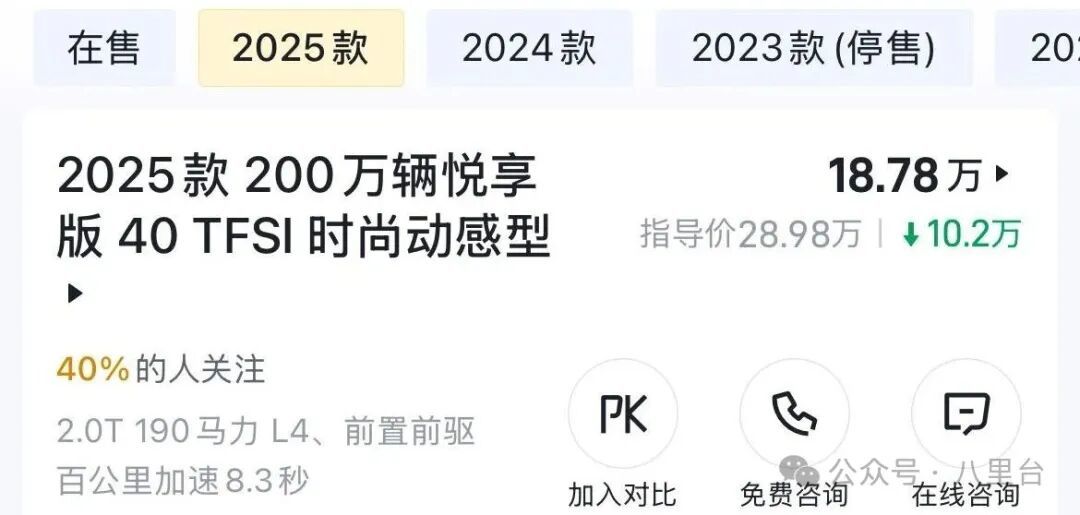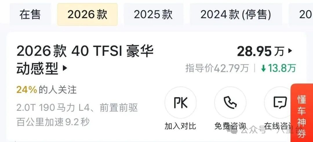 A4 40時(shí)尚動(dòng)感型價(jià)格已跌破20萬(wàn),網(wǎng)絡(luò)報(bào)價(jià)低至18萬(wàn)左右,進(jìn)入凱美瑞、亞洲龍的價(jià)格區(qū)間。