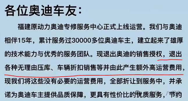 一份經(jīng)銷商退網(wǎng)的“告車友書”,暴露了銷量增長(zhǎng)背后的問題。福州老牌奧迪經(jīng)銷商福建原動(dòng)力的聲明指出,為完成廠家考核,經(jīng)銷商被迫高價(jià)進(jìn)貨、低價(jià)銷售,形成“進(jìn)銷倒掛”。