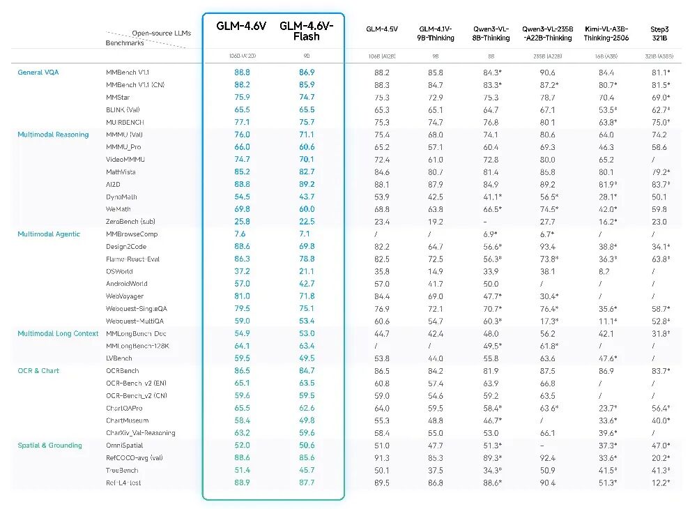 性能層面,同等參數(shù)規(guī)模下,GLM-4.6V系列在多模態(tài)交互、邏輯推理和長上下文等關(guān)鍵能力上達(dá)到SOTA水平。