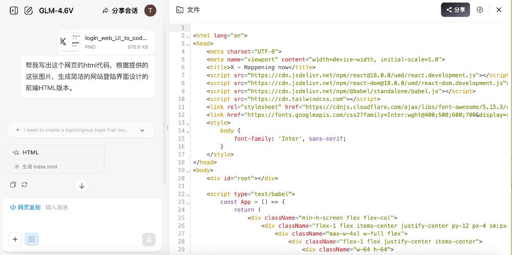收到指令后,GLM-4.6V立即逐行生成HTML代碼并顯示預(yù)覽頁面,生成的“仿X”登錄網(wǎng)頁與原網(wǎng)頁幾乎一致。