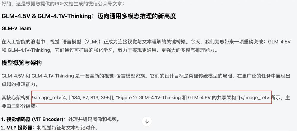 測試中上傳GLM-4.5V技術(shù)報(bào)告,要求生成圖文并茂的微信公眾號文章。約1-2分鐘后,GLM-4.6V完成文檔閱讀與理解,輸出包含標(biāo)題、導(dǎo)語、五個(gè)章節(jié)及結(jié)語的完整文章,但多次嘗試后,生成的圖片仍無法顯示。