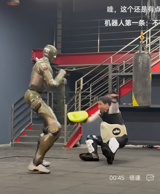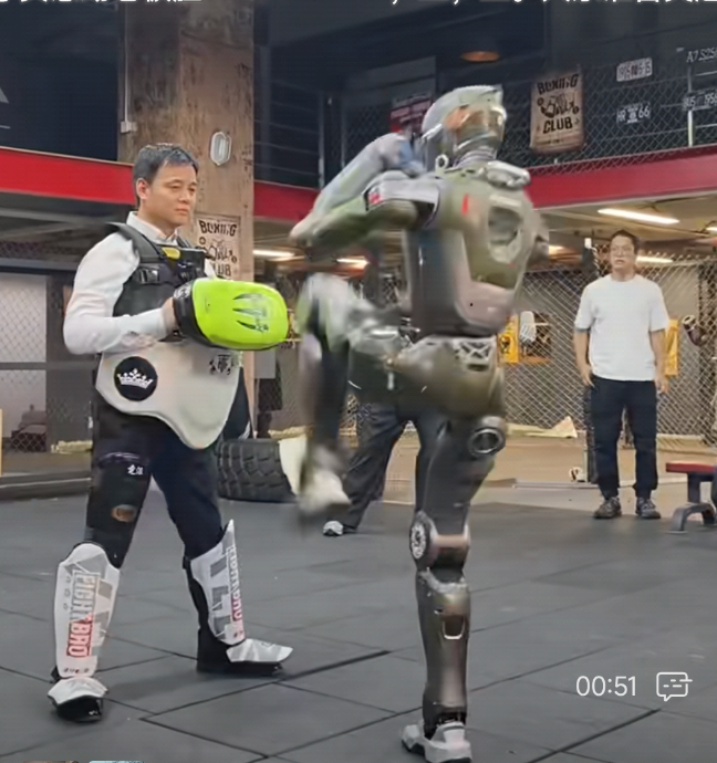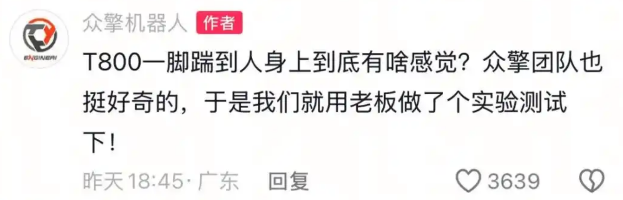 為了直觀展示機器人的動態(tài)性能,趙同陽穿戴護具親自參與測試。官方事后解釋稱,團隊好奇T800一腳踹在人身上的感覺,于是讓老板做了這個實驗。